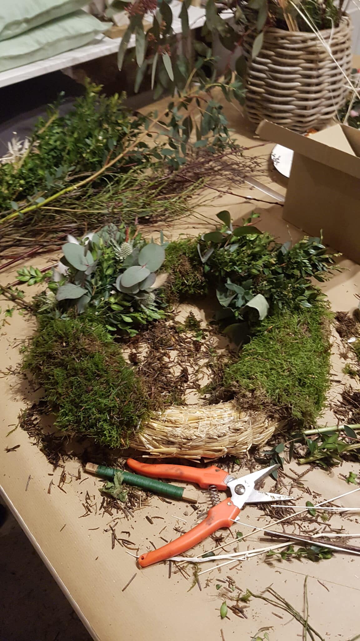 -Gemeinsames Binden und Einführung in die Kranzbindetechnik, sowie Vorstellung aller Materialien.